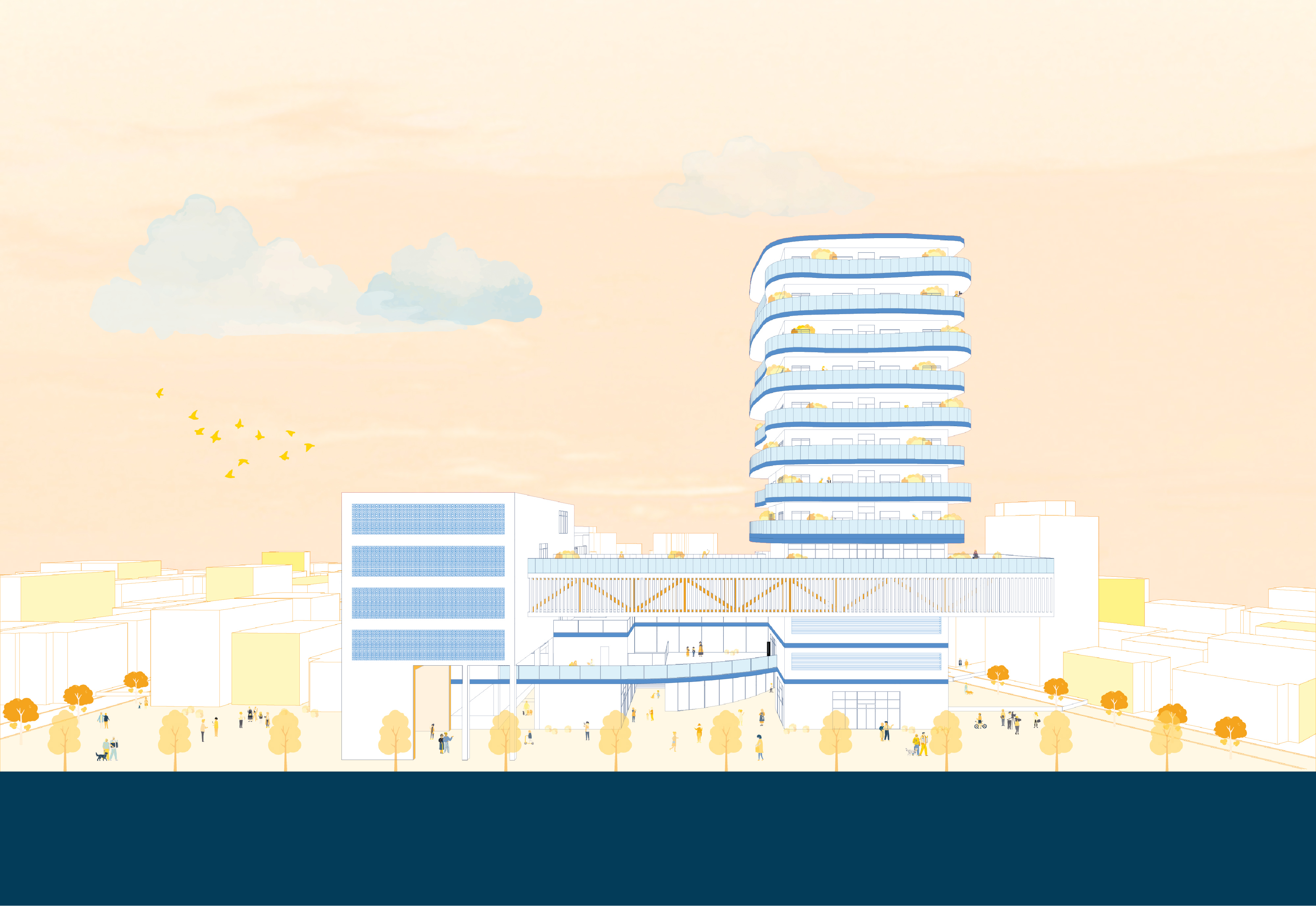 고령인구 비율의 증가로 노인이 주 사용자로 자리 잡을 것이다. 다만 노인들은 자유롭게 활동하지 못하고 사회에서 잊혀지고 있다. 이에 상업시설과 요양 전문인력 교육 센터를 중심으로 노인과 청년이 상호작용하며 세대교류가 일어나는 노인 주거를 제안하고자 한다. 각 공간을 원형의 동선으로 그리고 시각적으로 연결해 사용자들끼리 만남을 최대화했다.