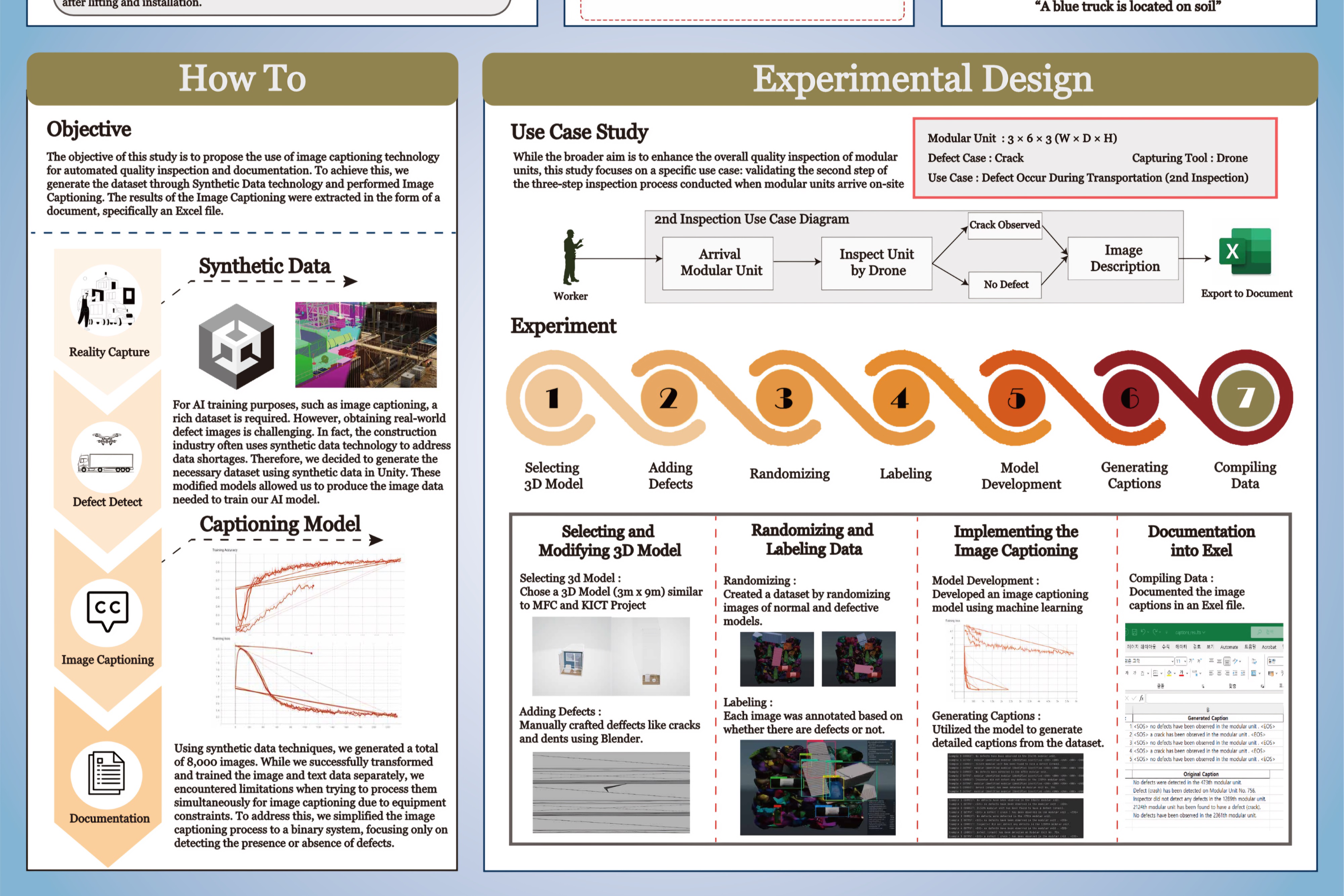 모듈러 공법은 현장의 작업과 공장의 제작이 동시에 진행되는 공법이다. 이로 인해 공사 기간 단축과 비용 절감이 가능하여 건설 산업에서 유망한 기술로 주목받는다. 그러나 현재 모듈러 건설 과정에서 하자 검수는 많은 항목에서 육안으로 이루어지고 있으며, 시간 제약으로 인해 하자가 발견돼도 묵인하는 경우가 종종 발생한다. 이러한 문제점을 해결하기 위해 이미지 캡셔닝(이미지에 대한 설명을 자동으로 생성하는 기술)을 활용하여 하자 여부를 빠르게 판별하고 그 결과를 문서화하는 방법을 제안한다.