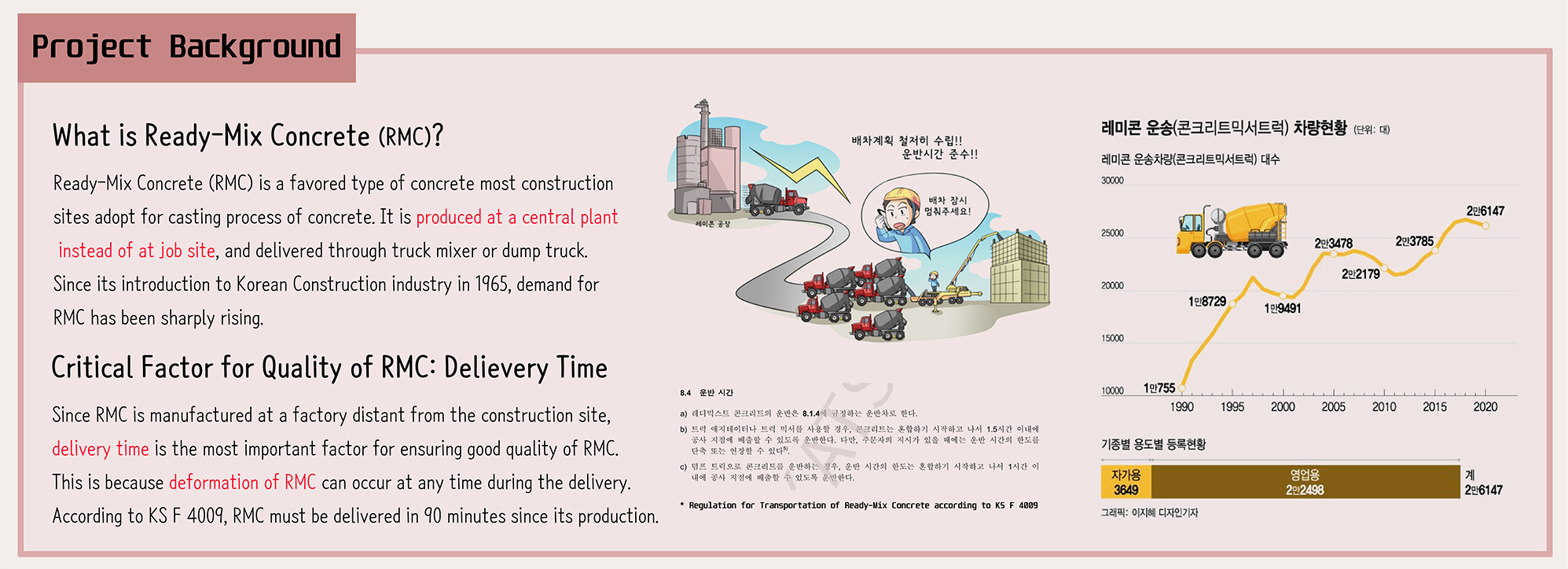 레디믹스콘크리트(RMC)는 국내 건설현장에서 사용되는 대표적인 콘크리트의 일종으로 공장에서 만들어져 굳기 전에 현장으로 빠르게 운송되는것이 품질관리에 있어 주된 사항이다.