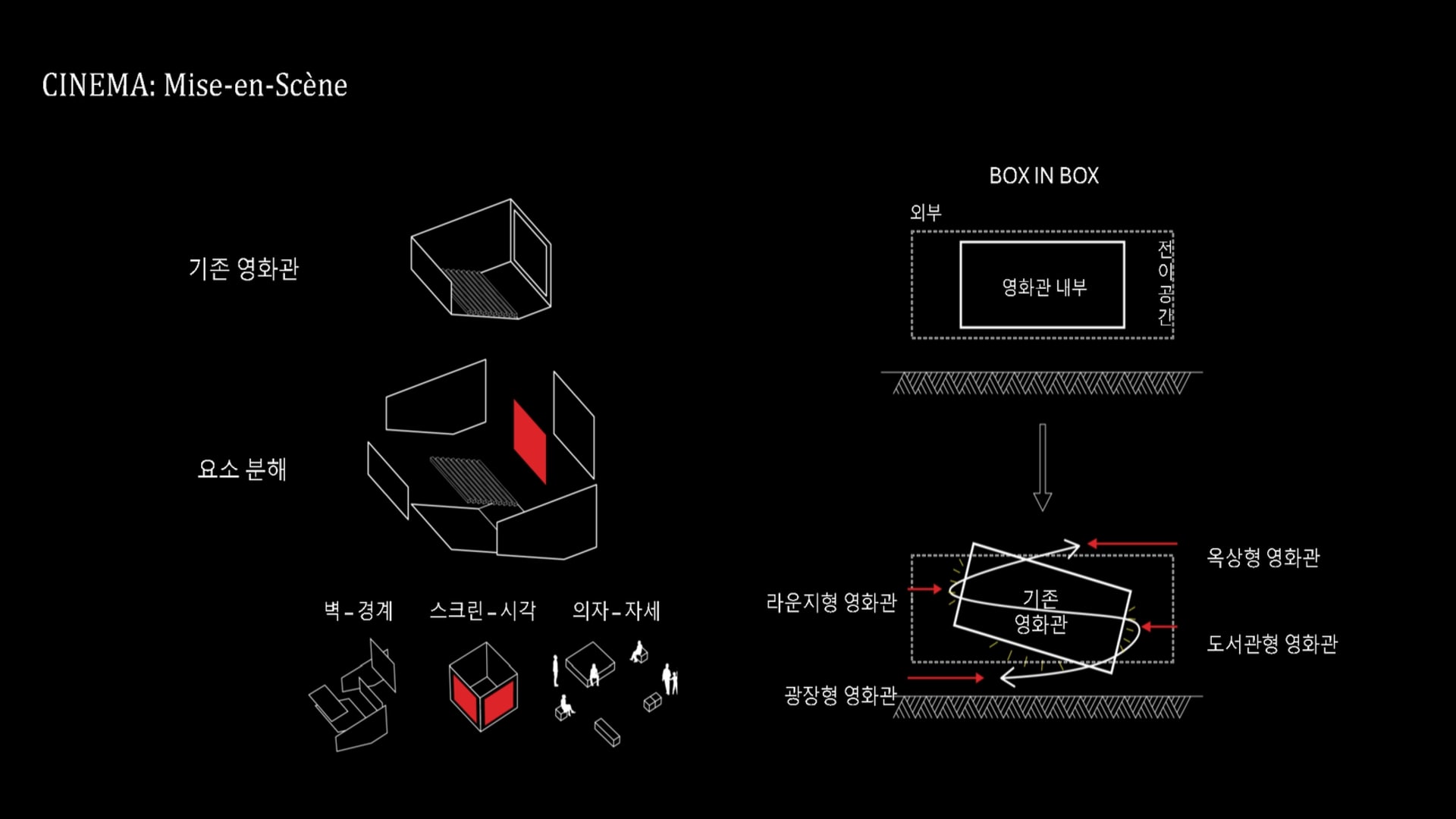 영화관은 단지 영화를 상영하는 장소를 넘어, 스크린을 매개로 사람들 간의 감정을 공유하고 소통하는 장이기도 하다.그렇다면 기능적 효용성만을 지닌 기존 영화관이, 일상 속 편하게 교류하는 공간에 해체되어 스며들 수는 없을까?