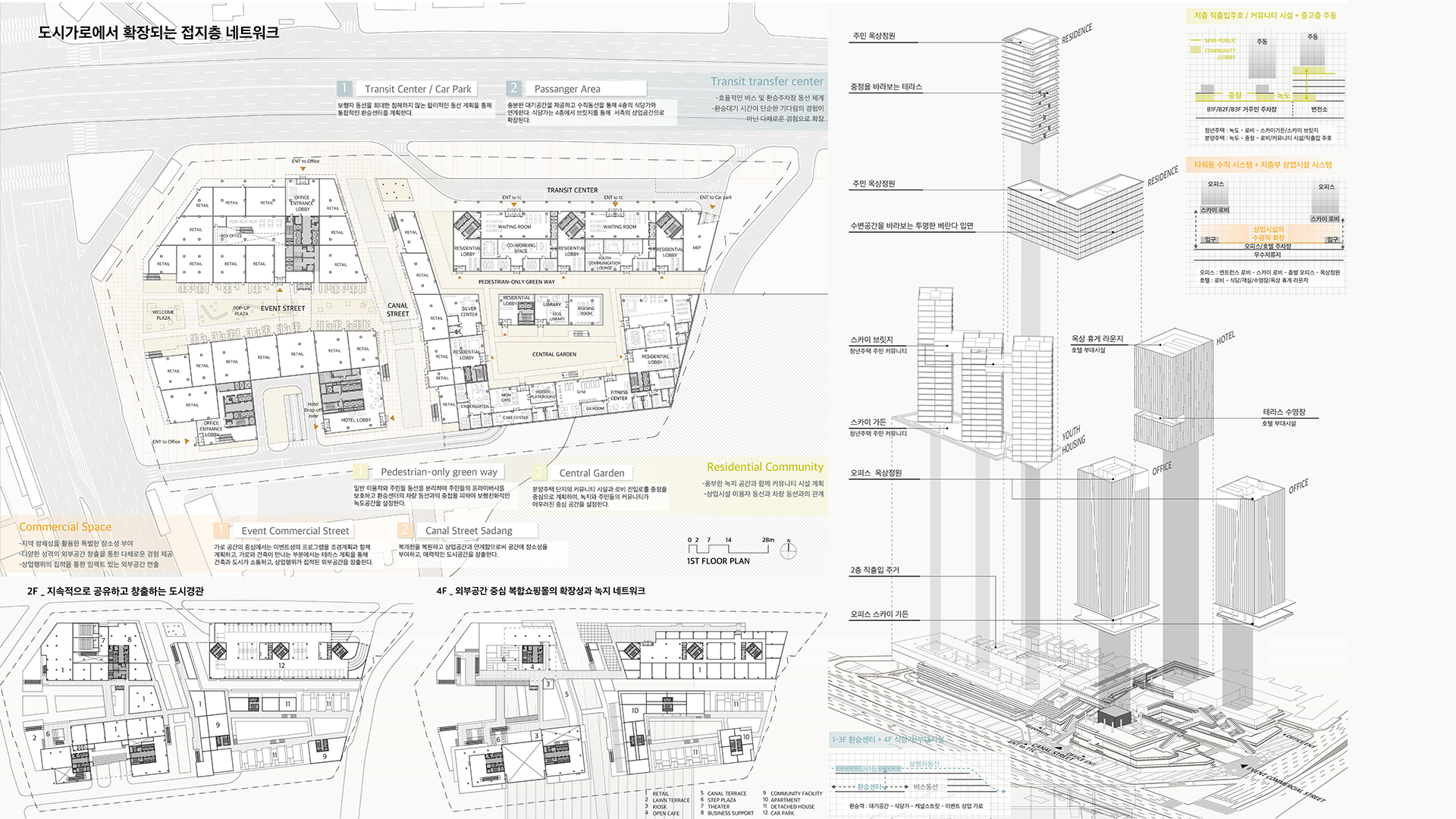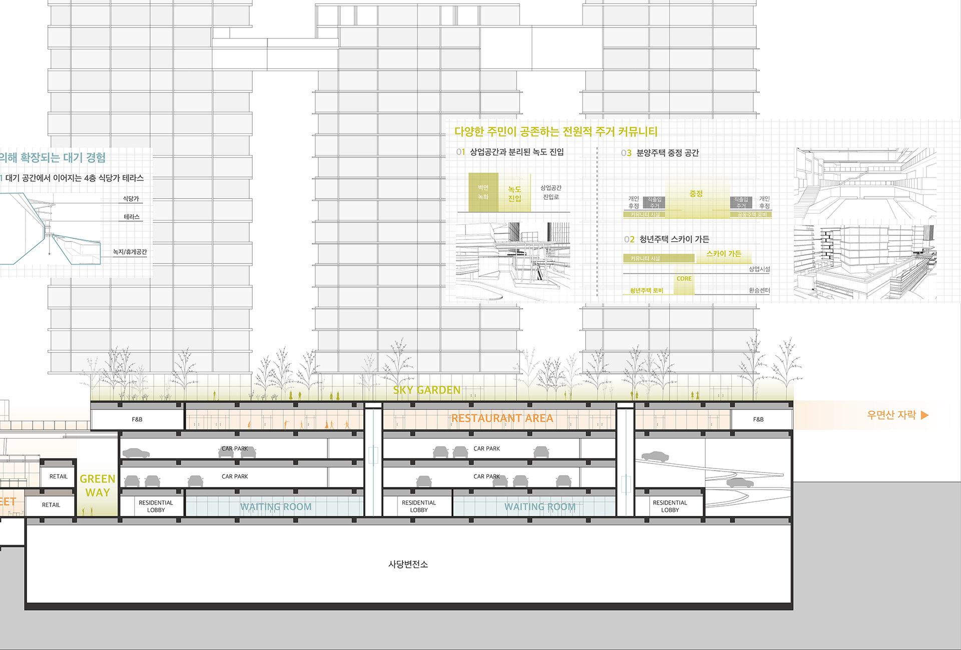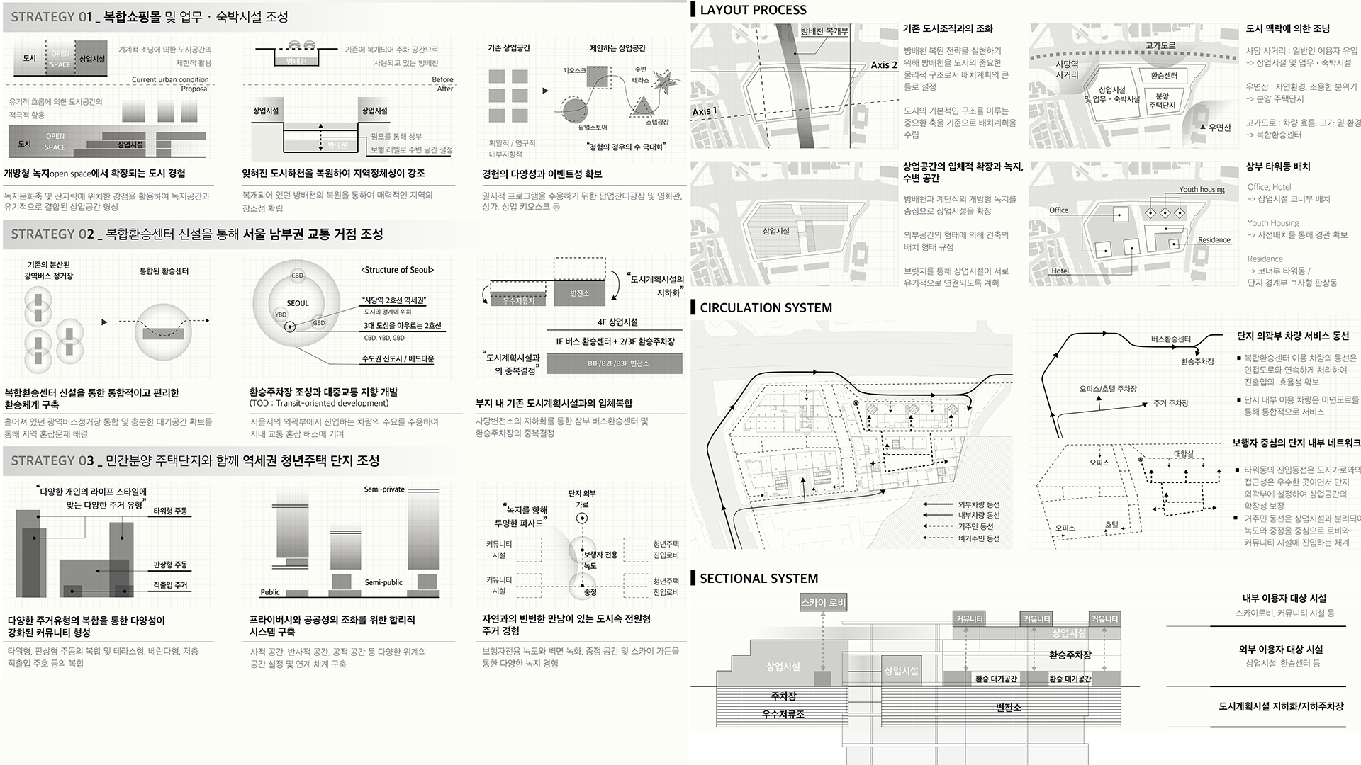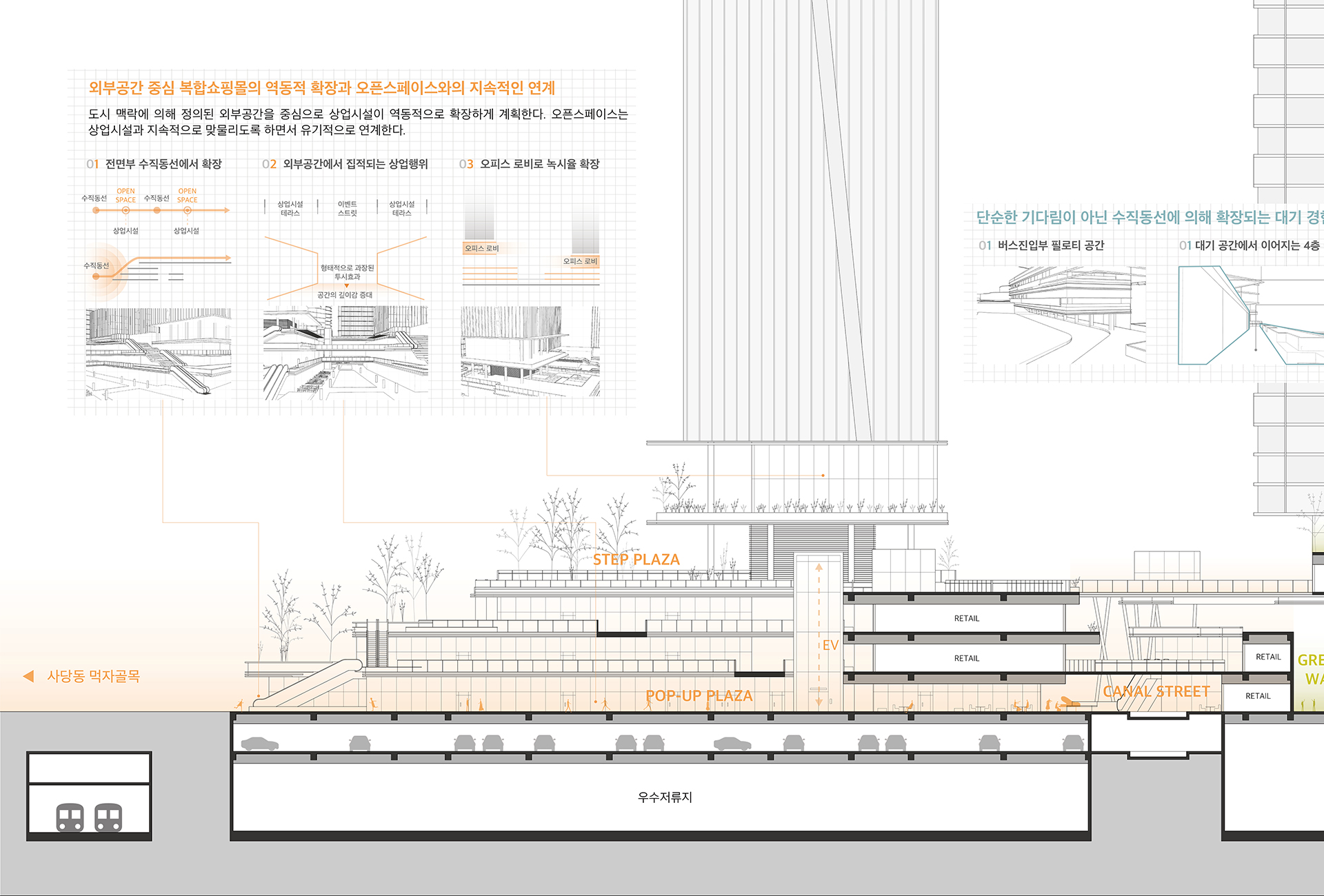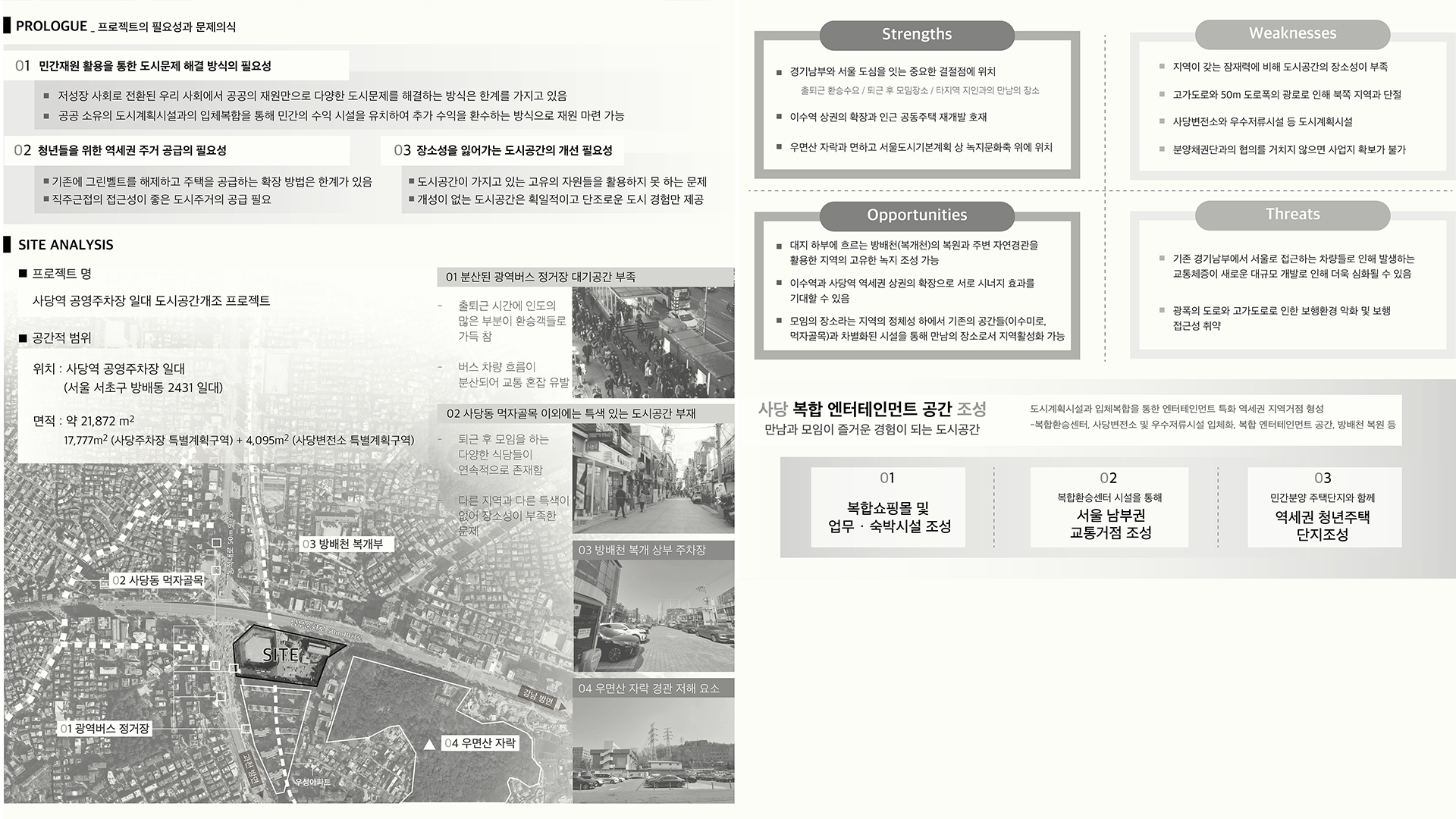 서울 서초구 사당역 공영주차장 일대는 수도권 남부와 서울 중심부를 연결하는 교통 요지임에 도 불구하고, 고가도로와 복개천, 도시계획시설 등으로 인해 도시 공간이 단절되고 장소성이 부족한 지역이다. 본 프로젝트는 이러한 도시적 문제를 해결하고, 서울 2040 도시기본계획에 부합하는 지역중심지로서의 위상을 강화하기 위해 복합적인 도시공간 재생 전략을 제안한다. 우선, 분산된 광역버스정류장과 혼잡한 교통 환경을 개선하기 위해 사당변전소 및 우수저류시 설의 지하화와 연계한 복합환승센터와 환승주차장을 입체적으로 구성하고, 이와 더불어 상업· 숙박·업무·주거가 어우러진 고밀 복합개발을 통해 교통과 일상이 유기적으로 연결되는 도시 거점으로 탈바꿈시킨다. 특히 방배천 복원을 통해 수변 공간을 회복하고, 저층부 상업시설과 연계된 캐널 스트리트 및 테라스 광장을 조성함으로써 지역 고유의 정체성을 담은 공공 외부 공간을 창출하였다. 주거 영역은 역세권 청년주택과 분양주택이 혼합된 형태로, 다양한 주거 유형과 위계의 커뮤니티 구조를 통해 생활의 다양성과 연속성을 고려하였다. 건축적으로는 녹 지 네트워크, 벽면녹화, 스카이가든 등을 도입하여 도심 속 전원형 주거 경험을 제공하고, 갈 색 계열의 수평적 입면과 유리 파사드를 활용해 자연의 흐름과 도시의 개방감을 함께 담아냈 다. 본 설계는 교통·주거·환경·상업이 융합된 입체적 도시공간 모델로서, 단절된 도시를 통합 하고 새로운 만남과 경험이 가능한 미래형 복합 중심지를 제안하고자 한다.