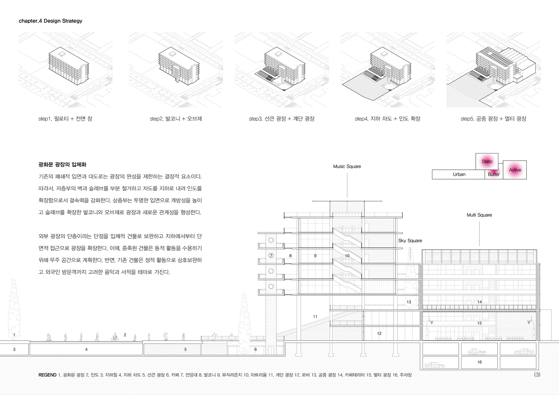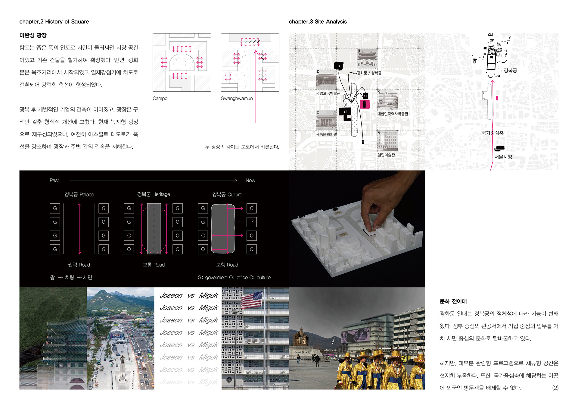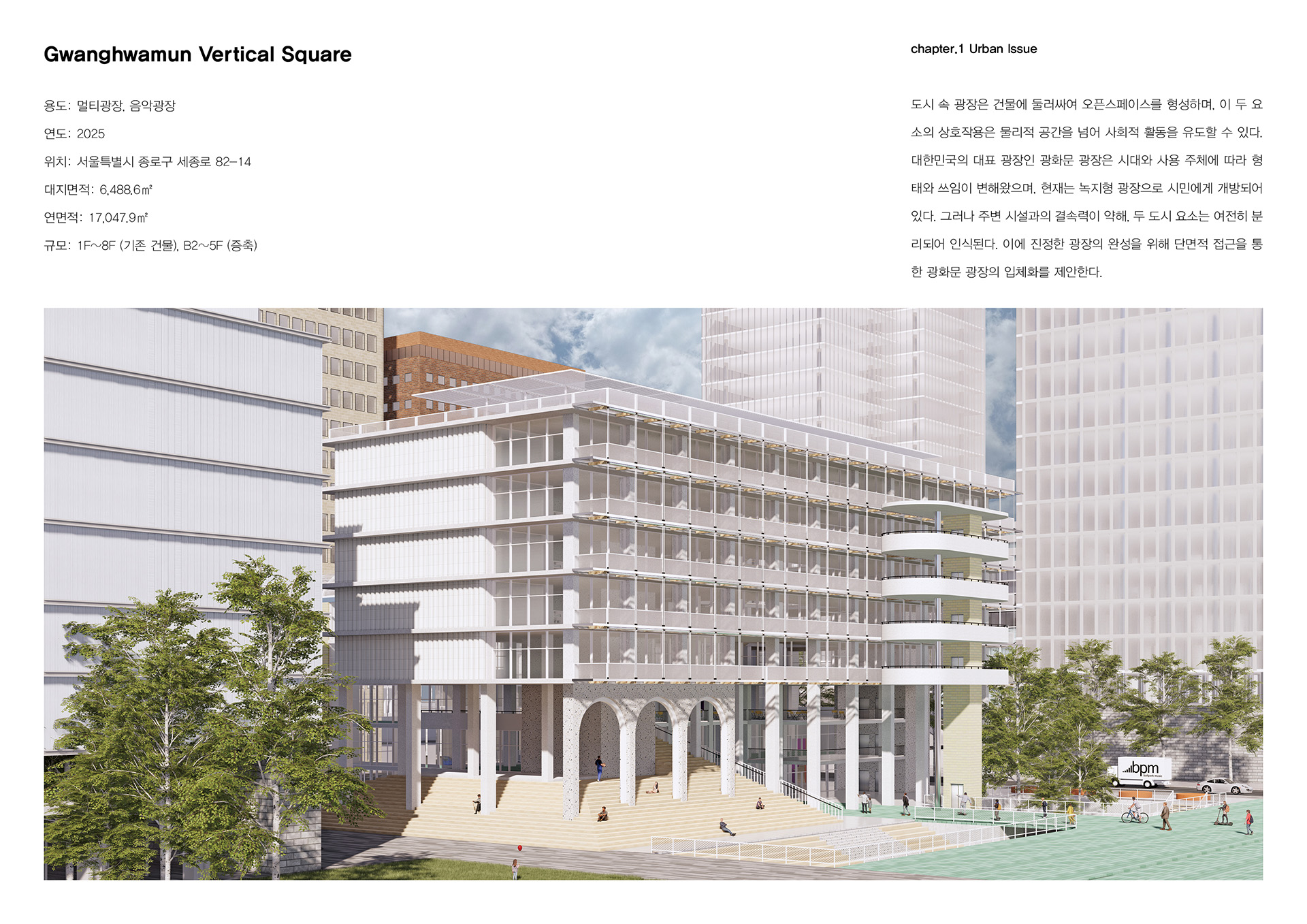 도시 속 광장은 건물에 둘러싸여 오픈스페이스를 형성하며, 이 두 요소의 상호작용은 물리적 공간을 넘어 사회적 활동을 유도할 수 있다. 대한민국의 대표 광장인 광화문 광장은 시대와 사용 주체에 따라 형태와 쓰임이 변해왔으며, 현재는 녹지형 광장으로 시민에게 개방되어 있다. 그러나 주변 시설과의 결속력이 약해, 두 도시 요소는 여전히 분리되어 인식된다. 이에 진정한 광장의 완성을 위해 광화문 광장의 입체화를 통한 건축적 확장을 제안한다.