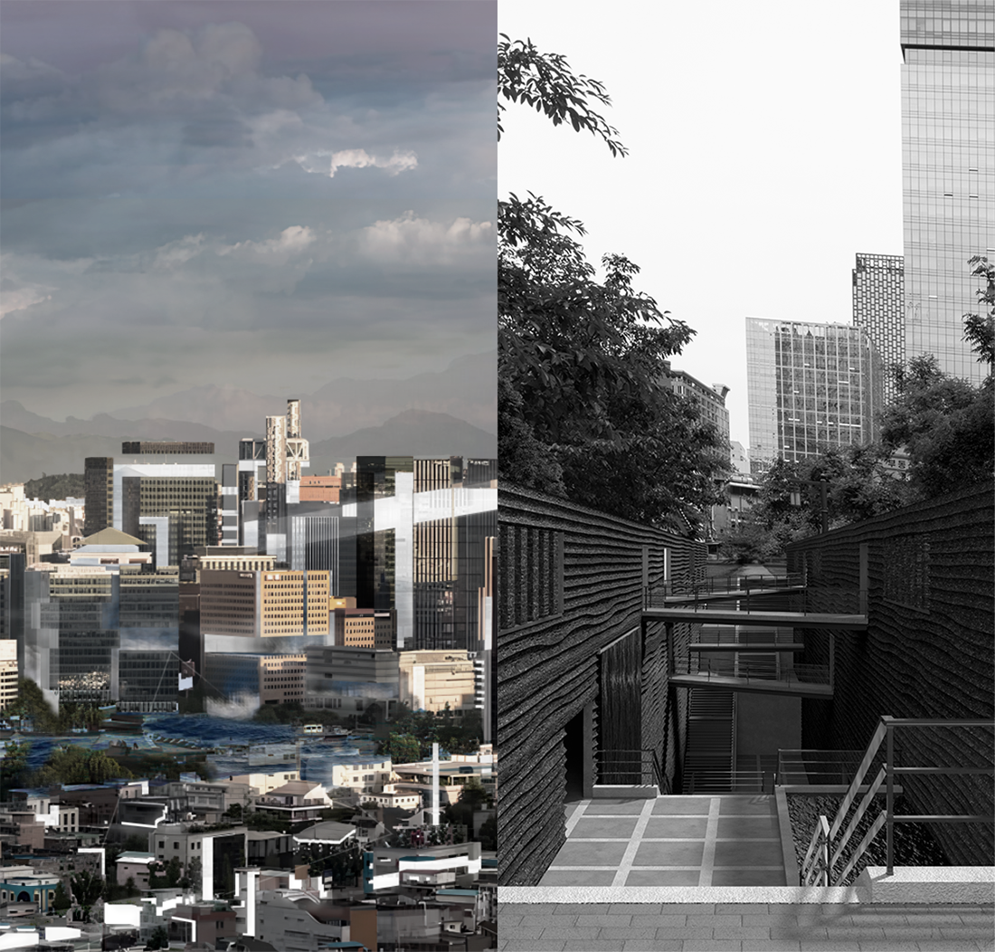 이번 프로젝트에서는 이런 무감각한 도시 속의 사람들이 잠시 도시 속에서 벗어나 감각을 회복시킬 수 있는 공간을 만들고자 한다. 광화문에서 사람들은 때로는 지상으로 때로는 지하로 각자의 도착지를 향해 매일매일 같은 길을 거쳐간다. 광화문의 고층건물들이 점점 더 위로 가는 것에 반해 점점 더 아래로 가는 공간은 빛, 물과 같은 감각들을 회복시켜줄 수 있는 매개체들이 극대화되며 동시에 광화문의 지하도시들을 연결하는 허브의 공간이 된다.